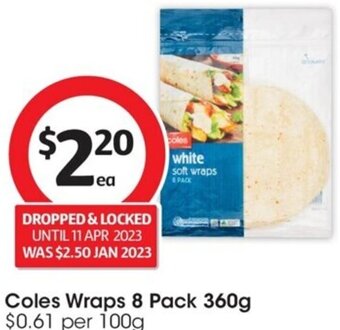 | Coles Soft Wraps 8 Pack 360g | Coles | $2.70 | $2.40 | $0.30 Discount | 07 February 2024 | 13 February 2024 | |