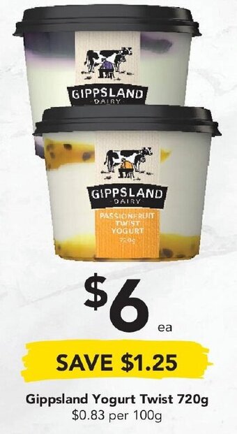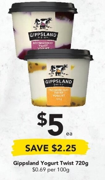| Gippsland Twist Yogurt 700 g | Drakes | $6.00 | 28 August 2024 | 03 September 2024 | |||