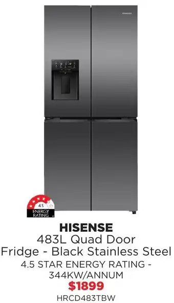 HISENSE 483L Quad Door Fridge Black Stainless Steel is currently on sale at Bing Lee, valid from 04-12-2025 to 21-12-2025. Find more great deals online and compare active offers to get the best price available. At Catalogueoffers.com.au, we list all current HISENSE 483L Quad Door Fridge Black Stainless Steel specials so you can plan your shopping wisely. Adjust your list based on current discounts and check back regularly for new promotions.Frequently asked questions about HISENSE 483L Quad Door Fridge Black Stainless Steel
