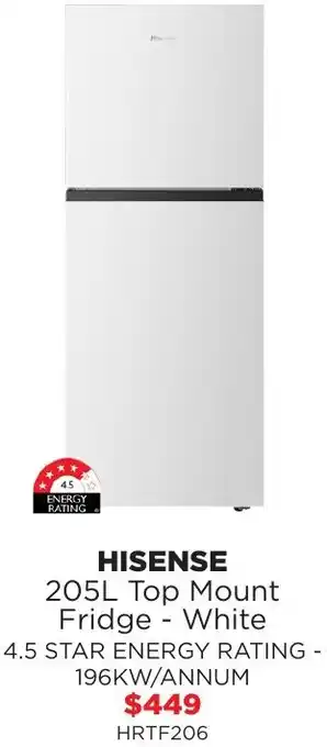 205L Top Mount Fridge White 4.5 STAR ENERGY RATING - 196KW/ANNUM