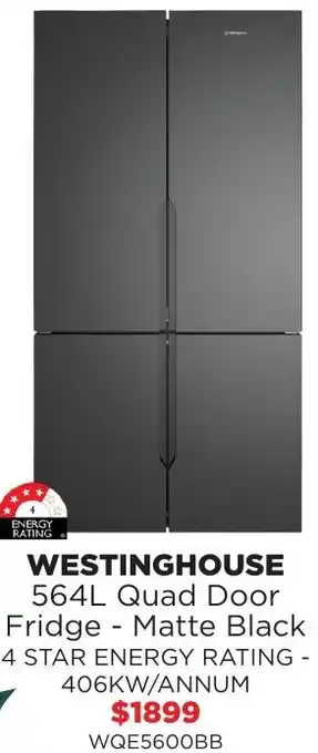 This Westinghouse 564l quad door fridge matte black is currently on special at Bing Lee. Check out the best deals and enjoy great savings while this product is on sale. Buy Westinghouse 564l quad door fridge matte black online via the Bing Lee website or grab it at the lowest available price nearby. Catalogueoffers.com.au collects all Westinghouse 564l quad door fridge matte black specials for you. Want to stay informed? Click the bell icon to get a free alert when this product is back on special or part of a new promotion.Frequently asked questions about Westinghouse 564l quad door fridge matte black