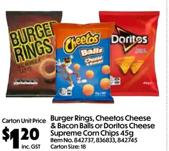 Burger rings, cheetos cheese & bacon balls or doritos cheese supreme corn chips 45 g