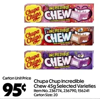 This offer is available in various stores, view all products to get the cheapest Chupa chup incredible chew. If you'd like to find out whether this product has a bigger discount in another store, check the category 'Supermarkets & Grocery Stores'. You may also find these offers interesting: Chupa Chups Incredible Chew Share Pack, Chupa chup jellies & Chupa chups jellies share bag.