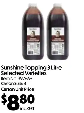 Campbells Wholesale offers a wide collection of products, besides the Sunshine topping. Keep an eye on the weekly Campbells Wholesale catalogue to find the best offers and promotions. Besides Sunshine topping, you can also find the following offers: Sunshine Tomato Or BBQ Sauce, Queen Sugar Free Topping Selected Varieties & offer 3.