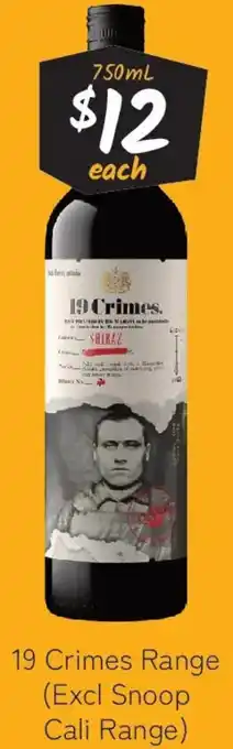 This offer is available in various stores, view all products to get the cheapest 19 Crimes Range (Excl Snoop Cali Range). If you'd like to find out whether this product has a bigger discount in another store, check the category 'Bottle Shops'. You may also find these offers interesting: 19 Crimes Snoop Cali Varieties, 19 crimes snoop cali select varietals & 19 Crimes Range.