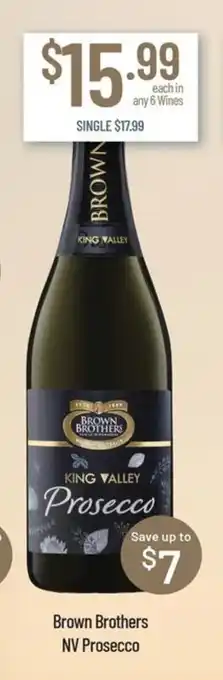 This offer is available in various stores, view all products to get the cheapest Brown brothers nv prosecco. If you'd like to find out whether this product has a bigger discount in another store, check the category 'Bottle Shops'. You may also find these offers interesting: Brown Brothers Prosecco, De bortoli king valley prosecco nv & Pre-Packed Brown Onions.