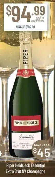 Piper heidsieck essentiel extra brut nv champagne is now part of a great promotion at Chambers Cellars. On this page, you’ll find all details about pricing, discount terms, and valid dates. You can also view similar Piper heidsieck essentiel extra brut nv champagne deals to make the best choice. This promotion is valid from 28-01-2026 to 24-02-2026. If it has ended, check out other current offers. Stay updated by following the product category to see when Piper heidsieck essentiel extra brut nv champagne goes on special again.Frequently asked questions about Piper heidsieck essentiel extra brut nv champagne