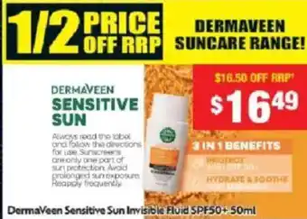 DermaVeen Sensitive Sun Invisible Fluid SPF50+ is currently on sale at Chemist Warehouse, valid from 24-12-2025 to 31-12-2025. Find more great deals online and compare active offers to get the best price available. At Catalogueoffers.com.au, we list all current DermaVeen Sensitive Sun Invisible Fluid SPF50+ specials so you can plan your shopping wisely. Adjust your list based on current discounts and check back regularly for new promotions.Frequently asked questions about DermaVeen Sensitive Sun Invisible Fluid SPF50+