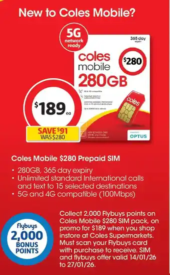 This offer is available in various stores, view all products to get the cheapest coles mobile. If you'd like to find out whether this product has a bigger discount in another store, check the category 'Supermarkets & Grocery Stores'. You may also find these offers interesting: Coles Mobile $280 Prepaid SIM, Aldi mobile & Opel mobile flip phone 6.