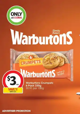 The price of Warburtons Crumpets can be found at the top of the page, together with the dates during which the offer is available. You can also check the price in the current Coles catalogue or on the Coles website. Promotional offers assure you of buying Coles products at the lowest price.