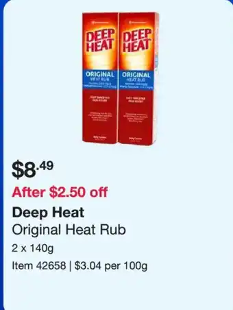 DEEP HEAT Original Heat Rub is now part of a great promotion at Costco. On this page, you’ll find all details about pricing, discount terms, and valid dates. You can also view similar DEEP HEAT Original Heat Rub deals to make the best choice. This promotion is valid from 19-01-2026 to 15-02-2026. If it has ended, check out other current offers. Stay updated by following the product category to see when DEEP HEAT Original Heat Rub goes on special again.Frequently asked questions about DEEP HEAT Original Heat Rub
