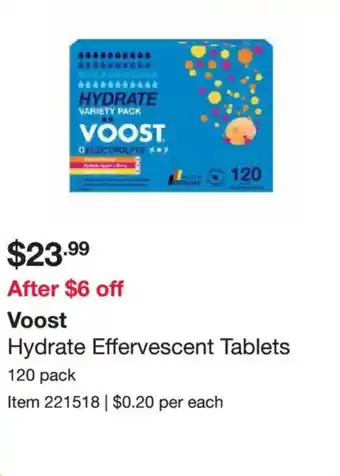 Costco offers a wide collection of products, besides the VOOST Hydrate Effervescent Tablets.. Keep an eye on the weekly Costco catalogue to find the best offers and promotions. Besides VOOST Hydrate Effervescent Tablets., you can also find the following offers: Voost hydrate electrolyte tablets, NEW Voost Hydrate Electrolyte Tablets Selected Varieties & Voost Hydrate Electrolyte Apple + Berry Tablets.