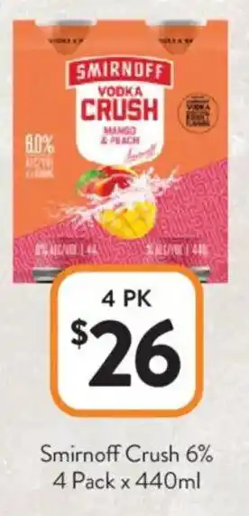 Foodworks offers a wide collection of products, besides the Smirnoff Crush 6%. Keep an eye on the weekly Foodworks catalogue to find the best offers and promotions. Besides Smirnoff Crush 6%, you can also find the following offers: Smirnoff Crush 6% Premix Range, Smirnoff crush 6% premix range cans & Smirnoff crush lemon lime.