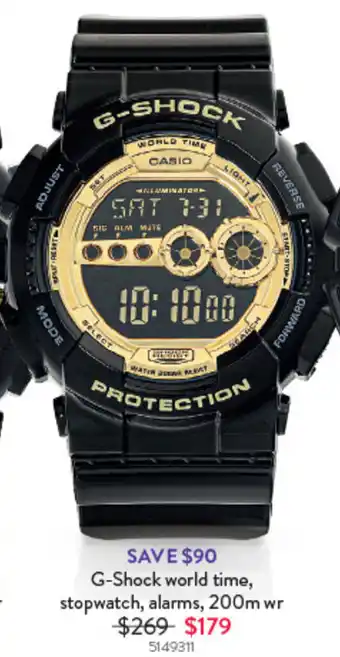 When is G-Shock world time, stopwatch, alarms, 200m wr on sale? Or are you wondering if G-Shock world time, stopwatch, alarms, 200m wr will be discounted next week? These are questions we hear all the time. Many shoppers plan ahead with a weekly list, and that’s why we always publish promotions early. That way, you know whether to buy now or wait for a better price. Keep an eye on our website to see if G-Shock world time, stopwatch, alarms, 200m wr will be on special next week.Frequently asked questions about G-Shock world time, stopwatch, alarms, 200m wr