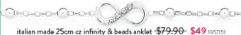 This offer is available in various stores, view all products to get the cheapest Italian made cz infinity & beads anklet. If you'd like to find out whether this product has a bigger discount in another store, check the category 'Jewellery, Watches & Accessories'. You may also find these offers interesting: Italian made figaro 3+1 anklet, Italian made love infinity bracelet & Italian made marine link anklet.