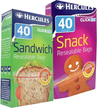 This offer is available in various stores, view all products to get the cheapest Hercules Resealable Snack Bags or Sandwich Bags 40 Pack. If you'd like to find out whether this product has a bigger discount in another store, check the category 'Supermarkets & Grocery Stores'. You may also find these offers interesting: Hercules Resealable Sandwich Bags, Hercules Everyday Resealable Snack Bags & Hercules Click Zip Sandwich or Snack Bags.