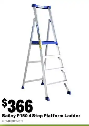 This Bailey p150 4 step platform ladder is currently on special at Mitre 10. Check out the best deals and enjoy great savings while this product is on sale. Buy Bailey p150 4 step platform ladder online via the Mitre 10 website or grab it at the lowest available price nearby. Catalogueoffers.com.au collects all Bailey p150 4 step platform ladder specials for you. Want to stay informed? Click the bell icon to get a free alert when this product is back on special or part of a new promotion.Frequently asked questions about Bailey p150 4 step platform ladder