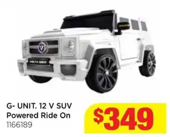 This offer is available in various stores, view all products to get the cheapest G-unit. 12 v suv powered ride on. If you'd like to find out whether this product has a bigger discount in another store, check the category 'Toys'. You may also find these offers interesting: shelf unit, Bendix 4wd/suv brake pads & Retro ride-on vespa.