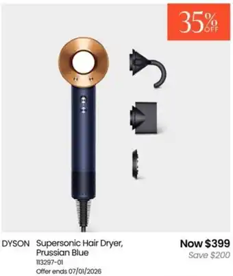 Dyson supersonic hair dryer, prussian blue is currently on sale at Myer, valid from 08-01-2026 to 26-01-2026. Find more great deals online and compare active offers to get the best price available. At Catalogueoffers.com.au, we list all current Dyson supersonic hair dryer, prussian blue specials so you can plan your shopping wisely. Adjust your list based on current discounts and check back regularly for new promotions.Frequently asked questions about Dyson supersonic hair dryer, prussian blue