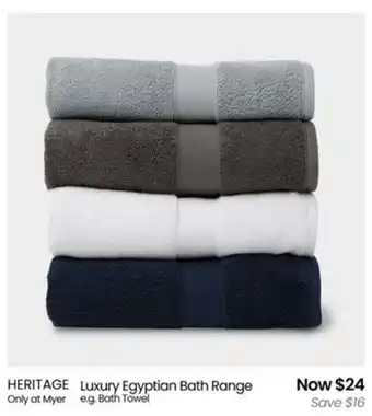 Myer offers a wide collection of products, besides the Heritage luxury egyptian bath range. Keep an eye on the weekly Myer catalogue to find the best offers and promotions. Besides Heritage luxury egyptian bath range, you can also find the following offers: Luxury egyptian bath towels, Heritage super plush bath range & Pinstripe Bath Range.