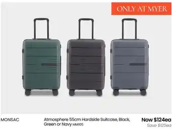 Myer offers a wide collection of products, besides the Monsac atmosphere hardside suitcase, black, green or navy. Keep an eye on the weekly Myer catalogue to find the best offers and promotions. Besides Monsac atmosphere hardside suitcase, black, green or navy, you can also find the following offers: Monsac m by monsac hue hardside suicase, pink, purple,blue or green, Samsonite enwrap spinner suitcase, matte black & American tourister curio 2 spinner, artic navy or black.