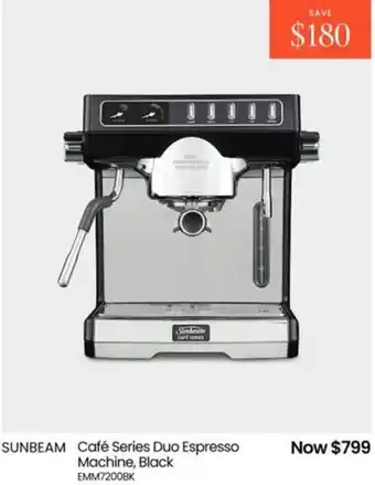 The price of Sunbeam café series duo espresso machine, black can be found at the top of the page, together with the dates during which the offer is available. You can also check the price in the current Myer catalogue or on the Myer website. Promotional offers assure you of buying Myer products at the lowest price.