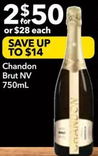 This offer is available in various stores, view all products to get the cheapest Chandon Brut NV. If you'd like to find out whether this product has a bigger discount in another store, check the category 'Supermarkets & Grocery Stores'. You may also find these offers interesting: Moët & Chandon Brut Impérial NV Champagne, Moët & chandon brut impérial nv champagne & Moet & chandon brut imperial champagne nv.