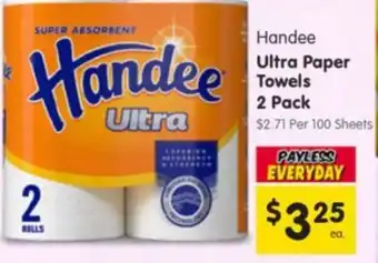 This offer is available in various stores, view all products to get the cheapest Handee Ultra Paper Towels. If you'd like to find out whether this product has a bigger discount in another store, check the category 'Supermarkets & Grocery Stores'. You may also find these offers interesting: Handee Ultra Triple Length Paper Towel, Handee Ultra Triple Length Paper Towel & Handee Paper Towel Ultra Super Absorbent White 2 Ply.