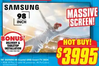 This SAMSUNG 98" DU9000 4K Crystal UHD Smart TV 2024 is currently on special at The Good Guys. Check out the best deals and enjoy great savings while this product is on sale. Buy SAMSUNG 98" DU9000 4K Crystal UHD Smart TV 2024 online via the The Good Guys website or grab it at the lowest available price nearby. Catalogueoffers.com.au collects all SAMSUNG 98" DU9000 4K Crystal UHD Smart TV 2024 specials for you. Want to stay informed? Click the bell icon to get a free alert when this product is back on special or part of a new promotion.Frequently asked questions about SAMSUNG 98" DU9000 4K Crystal UHD Smart TV 2024